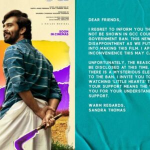 മലയാളി താരം ഷെയ്ൻ നിഗമും മഹിമ നമ്പ്യാരും പ്രധാന വേഷത്തിലെത്തുന്ന ലിറ്റിൽ ഹാർട്ട്സിന് ഗൾഫ് രാജ്യങ്ങളിൽ പ്രദർശന വിലക്ക്. ഇത് സാന്ദ്ര തോമസിന്റെ കുറിപ്പ് ഇങ്ങനെ, ‘ആത്മാവും ഹൃദയവും നൽകി ഞങ്ങൾ…